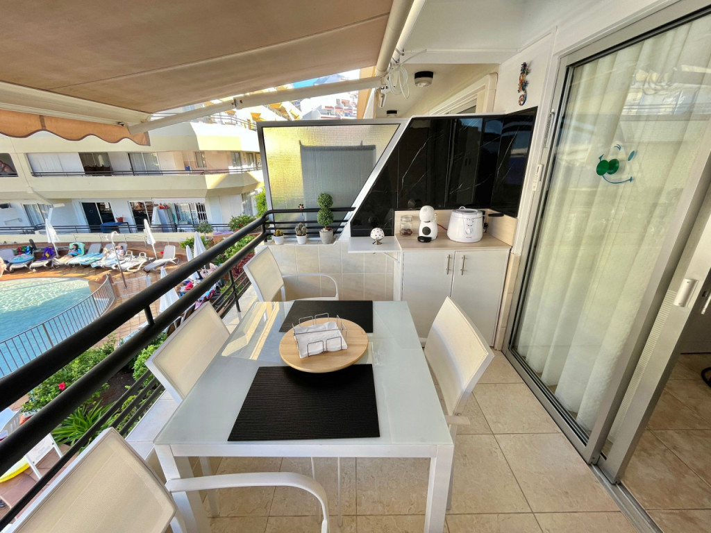 The balcony provides a delightful view of the swimming pool and partial views of the sea, along with storage cupboards.
