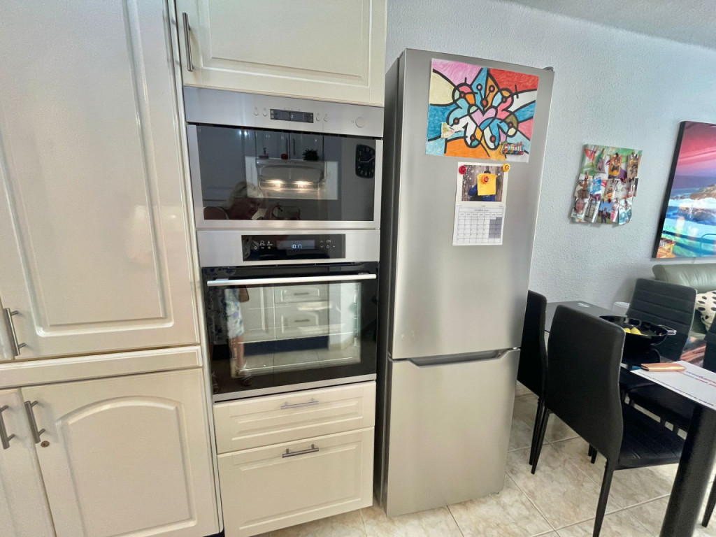 The kitchen, furnished with new appliances and an induction hob, includes two fridges, a built-in oven, and a microwave.