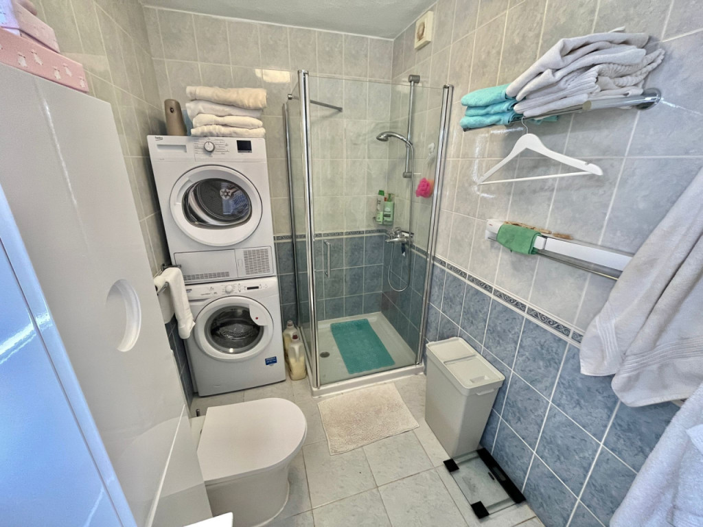 The well-sized bathroom hosts a shower unit and comes equipped with a washing machine and tumble dryer.