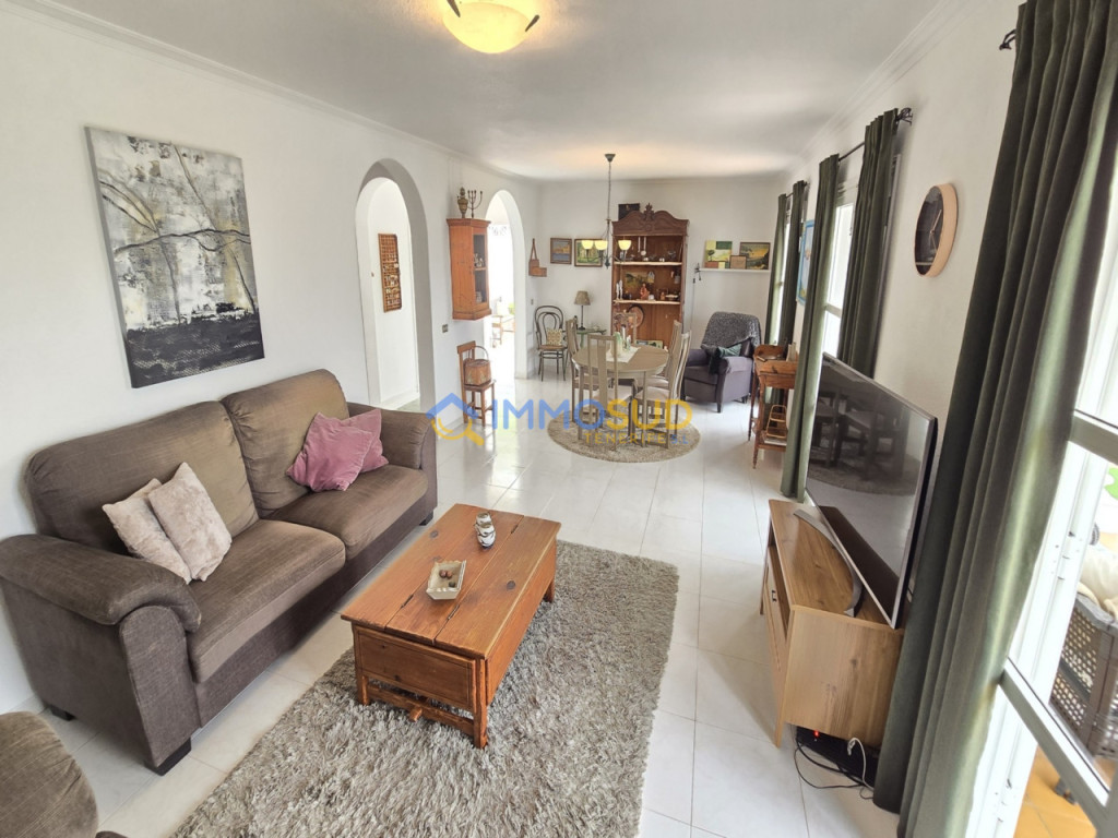 Upon entering the villa, you will be greeted by a spacious and bright living room that opens onto a terrace with a cozy chill out area, ideal for relaxing and enjoying the Canarian climate.