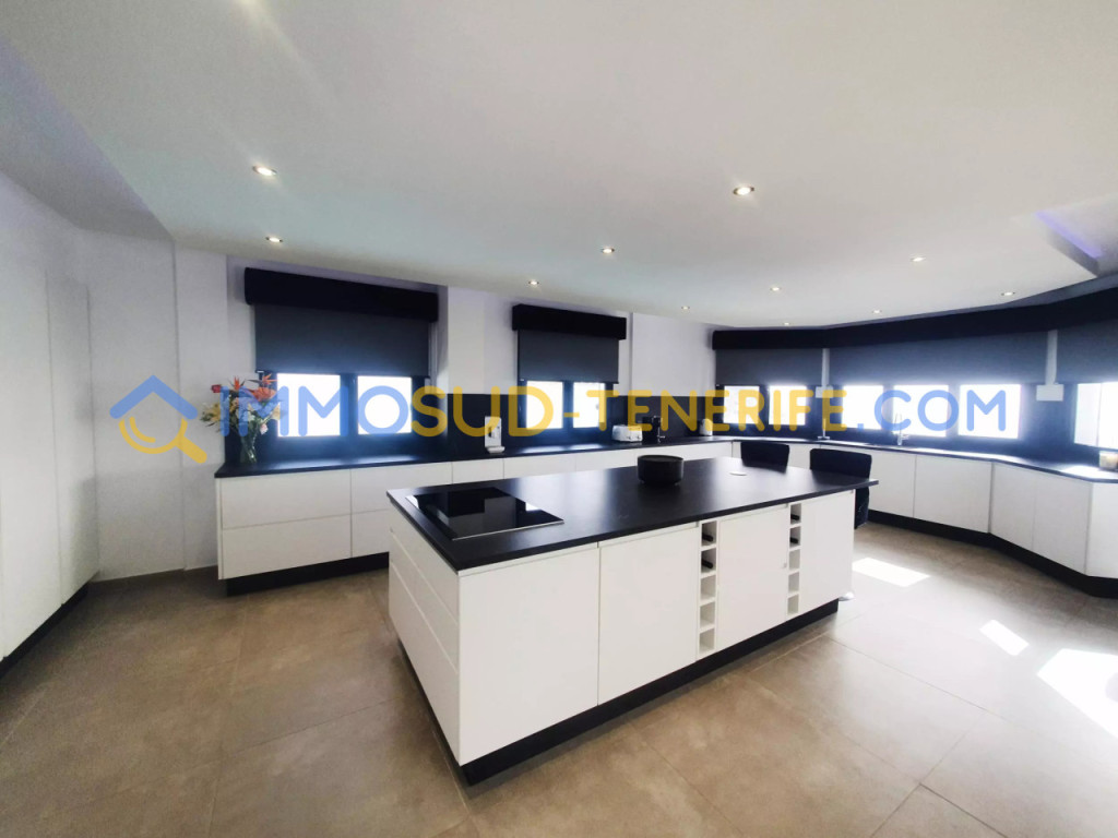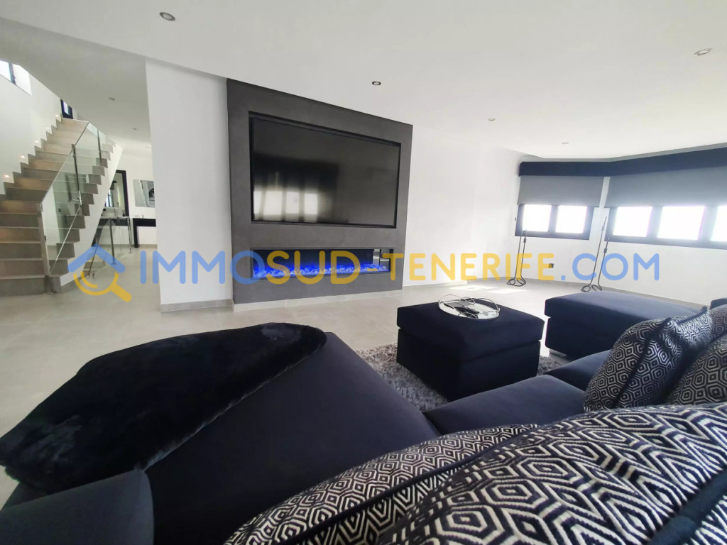 "Immosud Tenerife SL" vous présente cette superbe villa individuelle est située sur un terrain généreux de 775 m2 et offre une vue imprenable sur la côte de Costa Adeje, l'océan Atlantique et La Gomera. Elle dispose de sept chambres, sept salles de bains, un WC et un appartement séparé et indépendant. La principale zone de vie s'étend sur deux étages, avec des pièces supplémentaires dans le grenier et au niveau inférieur du rez-de-chaussée. La cuisine/salle à manger à aire ouverte est magnifiquement conçue avec des appareils haut de gamme, un îlot central et une grande table à manger. La villa comprend également un grand salon avec une cheminée, un élégant escalier en verre menant à trois chambres d'amis au premier étage, ainsi qu'un étage mansardé avec un salon et une chambre. Le niveau inférieur du rez-de-chaussée offre une buanderie entièrement équipée, une salle de jeux avec table de billard et table de air hockey, ainsi qu'une salle de cinéma. À l'extérieur, il y a de vastes terrasses, un espace barbecue couvert, une piscine chauffée, un jacuzzi et un garage double. Cette somptueuse maison a été entièrement rénovée avec un souci du détail impeccable et offre le cadre idéal pour recevoir et profiter de l'environnement magnifique.