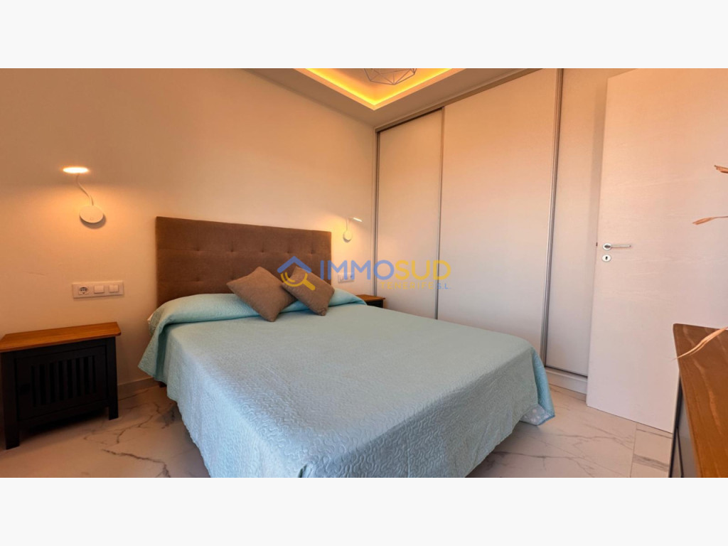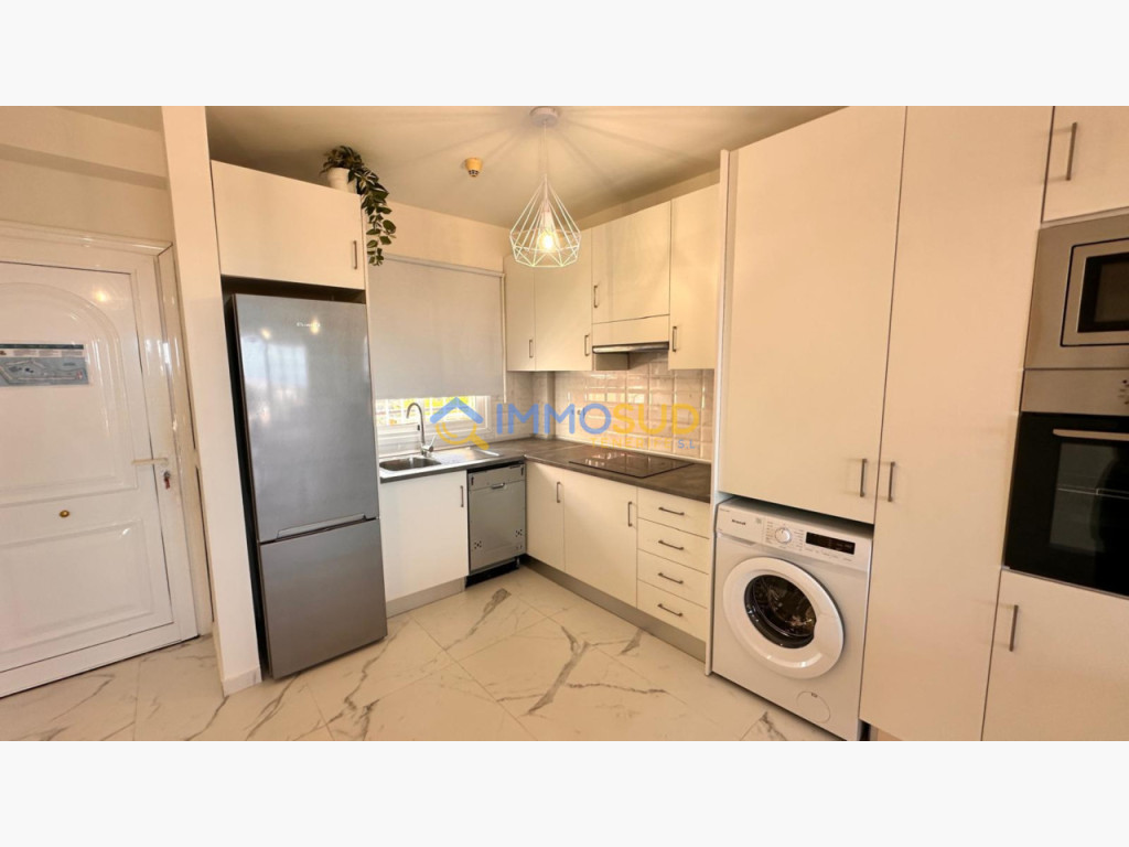 ce penthouse entièrement rénové. Le penthouse se compose de 2 chambres avec placards, 1 salle de bain, entièrement rénové, grande cuisine ouverte entièrement meublée et équipée et un salon lumineux, qui s'ouvre sur un balcon avec vue sur la mer.