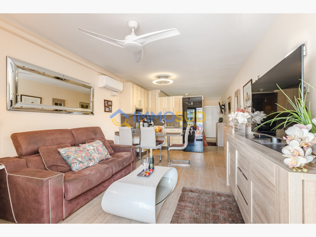 Le studio en très bon état, est comme neuf et offre un espace "chambre", une salle de bain avec douche, une cuisine américaine équipée avec réfrigérateur (Siemens), un grand et lumineux salon avec accès direct à la grande terrasse avec vue latérale sur la mer et vue sur la rue.